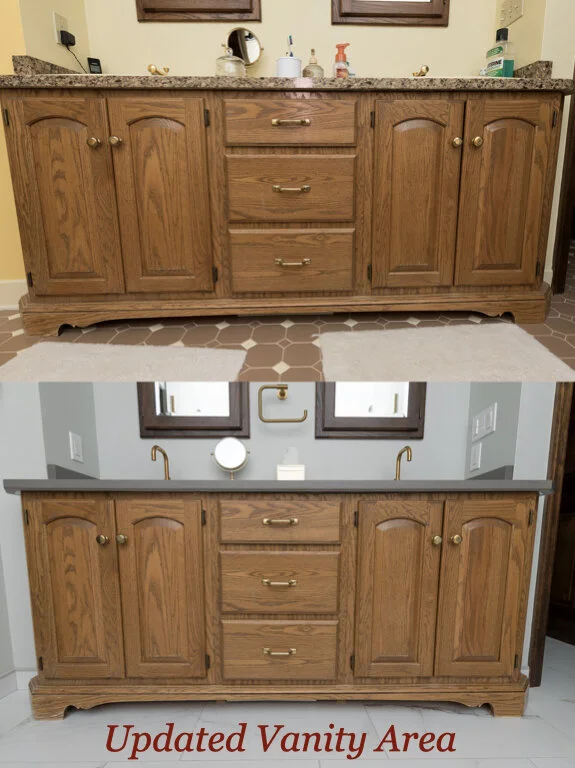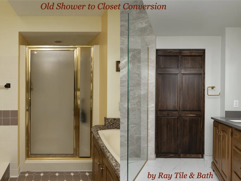 Click on a picture below to enlarge and view the entire gallery. For this project, we removed a large Jacuzzi tub and replaced it with a beautiful, custom double shower. The sh0wer features a curbless entry and linear drains against the wall-to-wall bench along the back. Since the small shower was no longer needed, per the homeowner’s request, we converted that area to a custom closet with a lot of storage space. Per the homeowner’s request, we preserved the vanity (which was in excellent condition, so why waste it?), but updated it with a new top and sink fixtures. We also preserved the medicine cabinet mirrors. We took them apart and completely refinished them to match the wood finish of the closet doors (which were stained to match the other doors throughout the area). There was also quite a bit of drywall work and painting involved. We love the look of the tile all the way up to the vaulted ceiling in the shower. The gold Kohler fixtures really stand out and compliment the grey porcelain tile which has the look of stone.